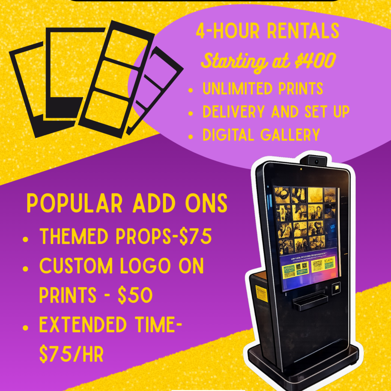 Give your guests something fun to do AND something to take home. Our unattended photo kiosk is a sleek, self-serve setup that lets guests walk up, strike a pose, and walk away with instant printed photos in hand. No attendant, no pressure- just good times and real memories.
